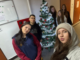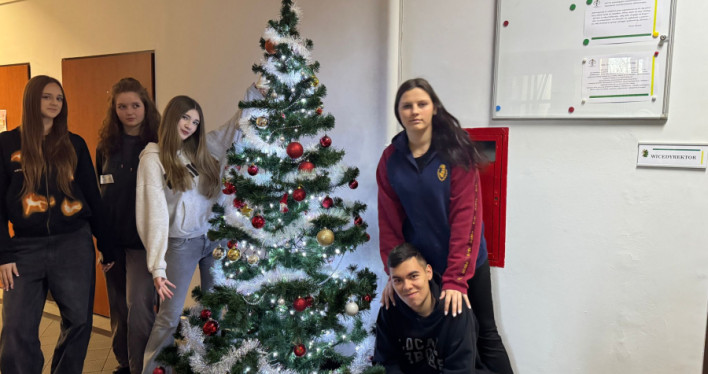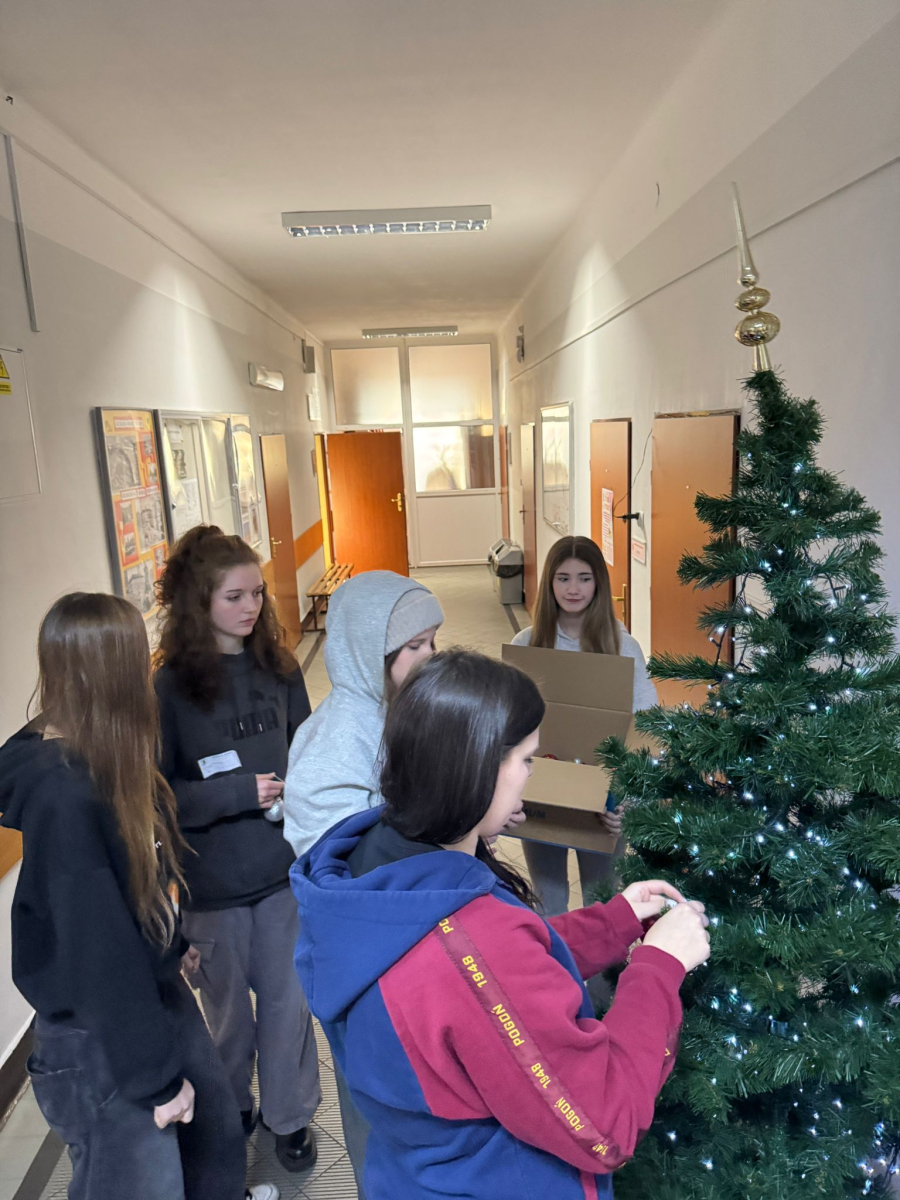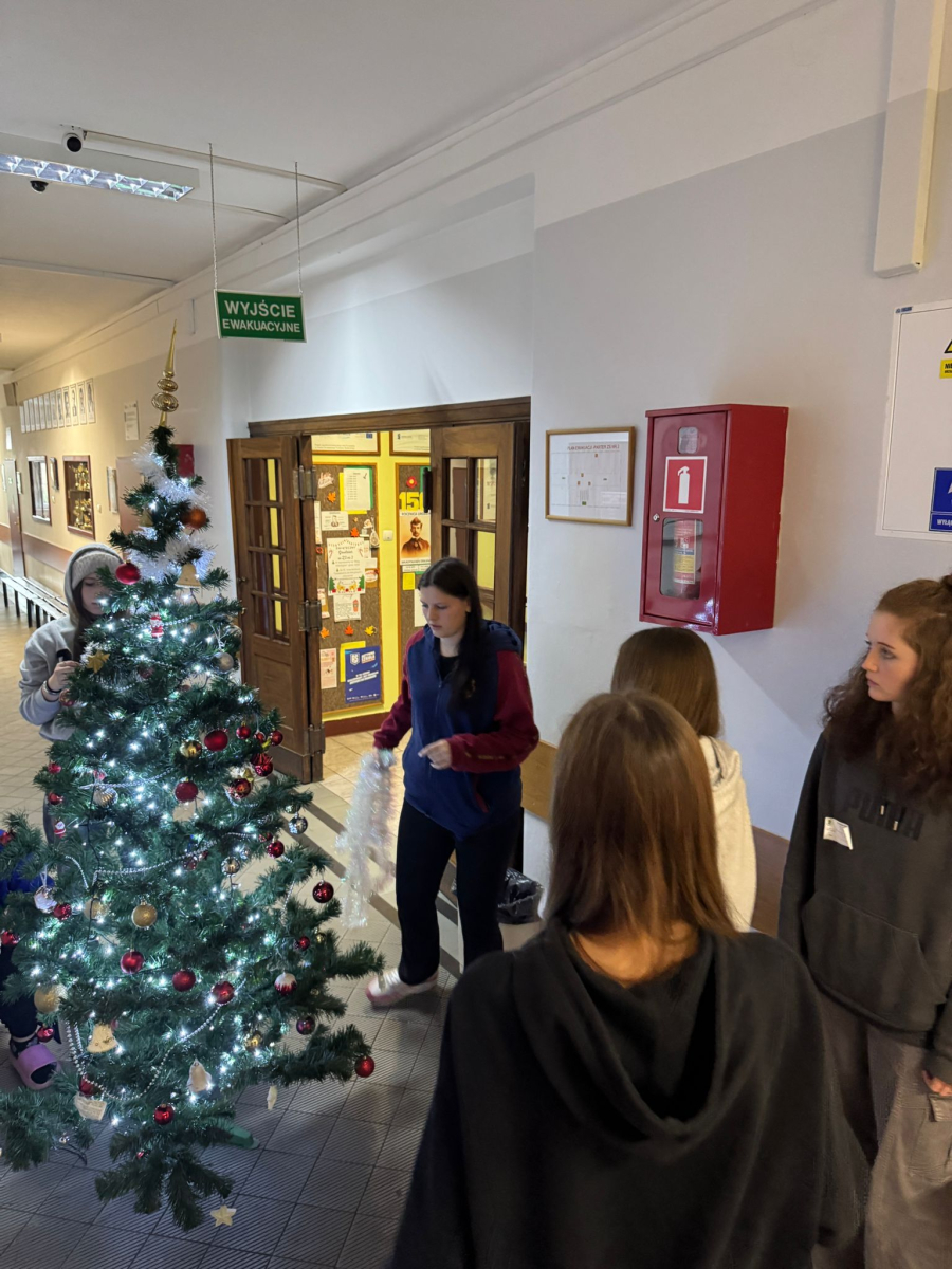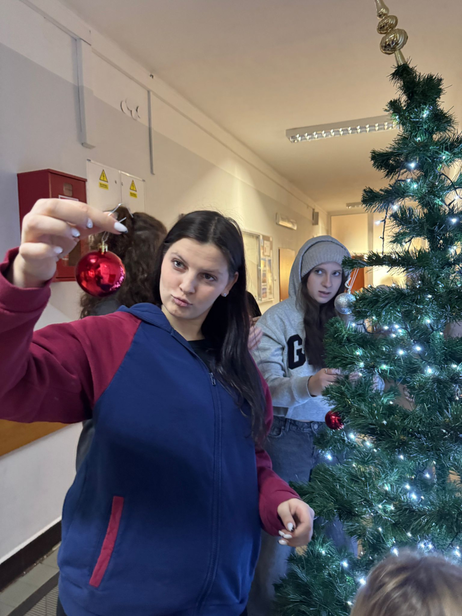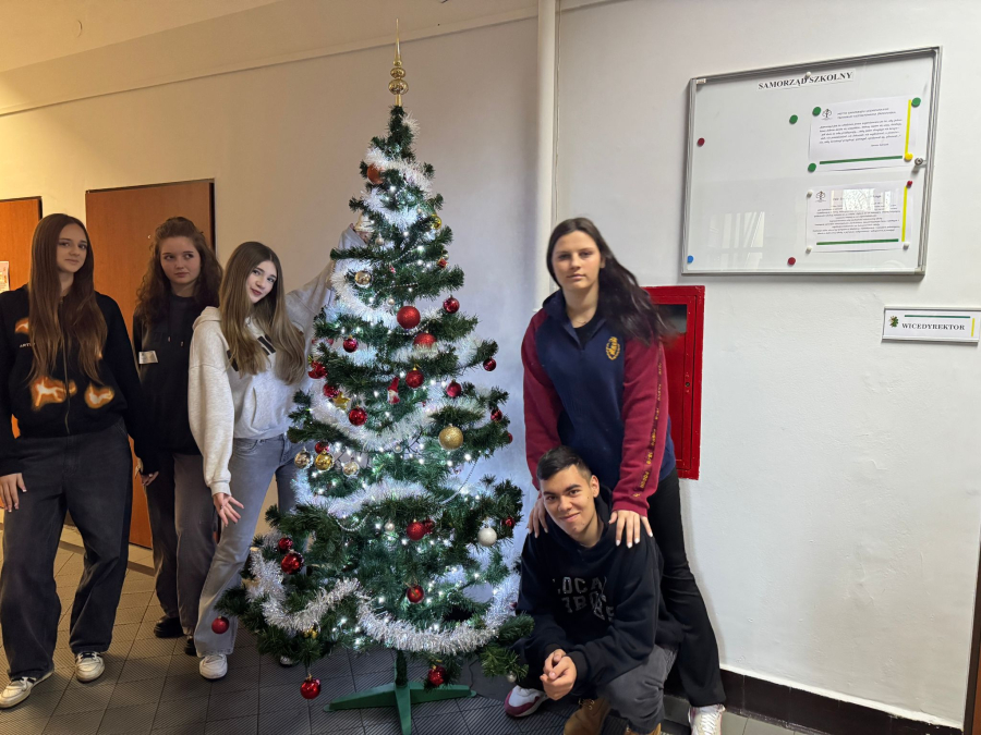 Dzisiaj Samorząd Uczniowski ubrał szkolną choinkę. Było trochę śmiechu i podejrzane miny...