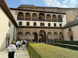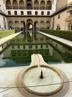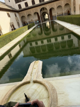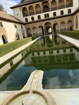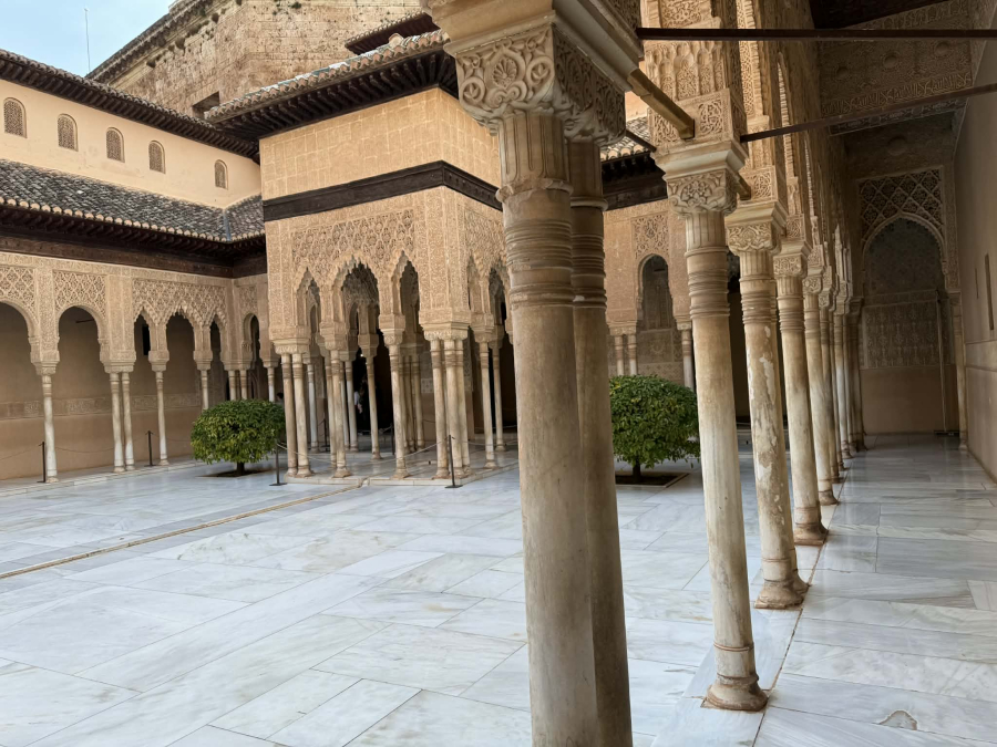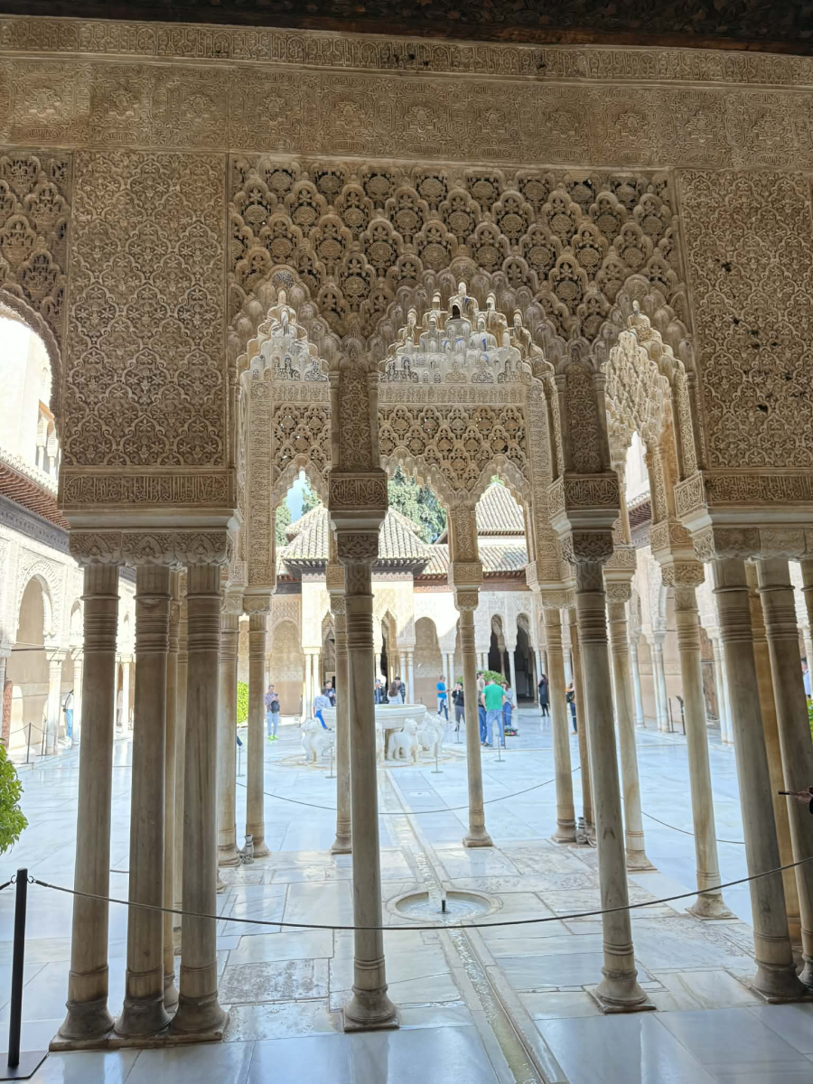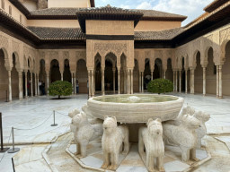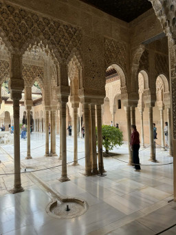 Zawitaliśmy też na Dziedziniec Lwów - bo jakże nie zrobić zdjęcia motywu, który jest na większości kartek i magnesów z Granady. Tu oko zawieszamy na galerii przypominającej krużganki chrześcijańskich klasztorów, przewodniczka przyrównuje je do lasu marmurowych palm.
