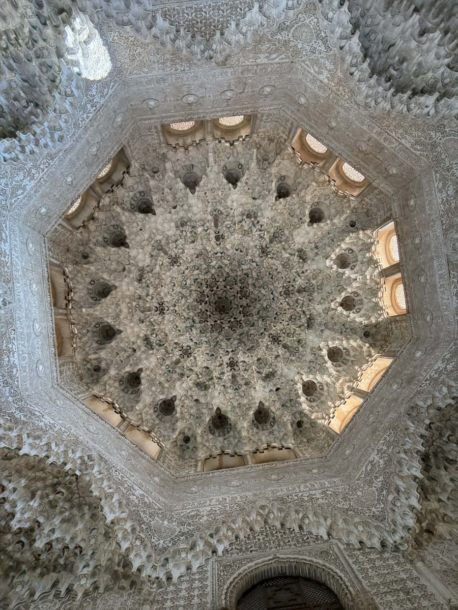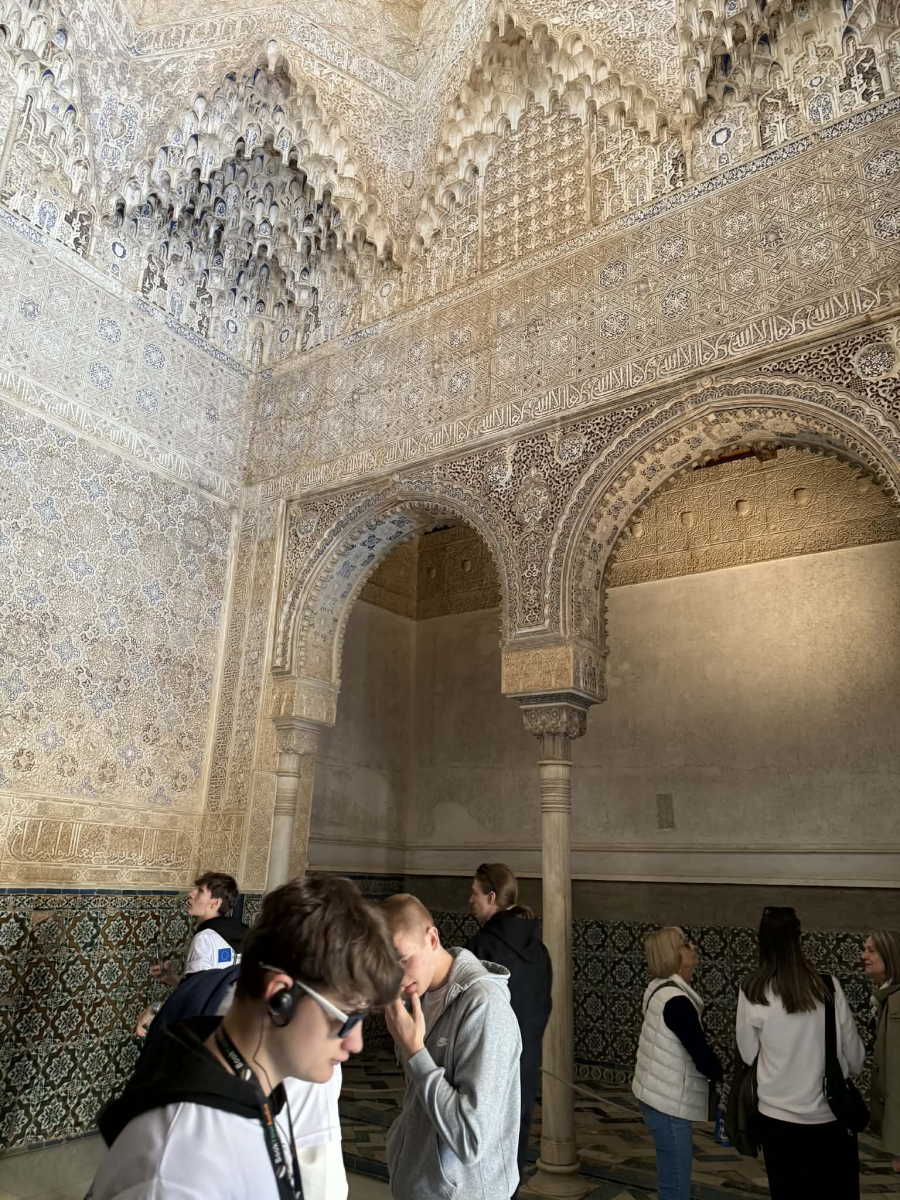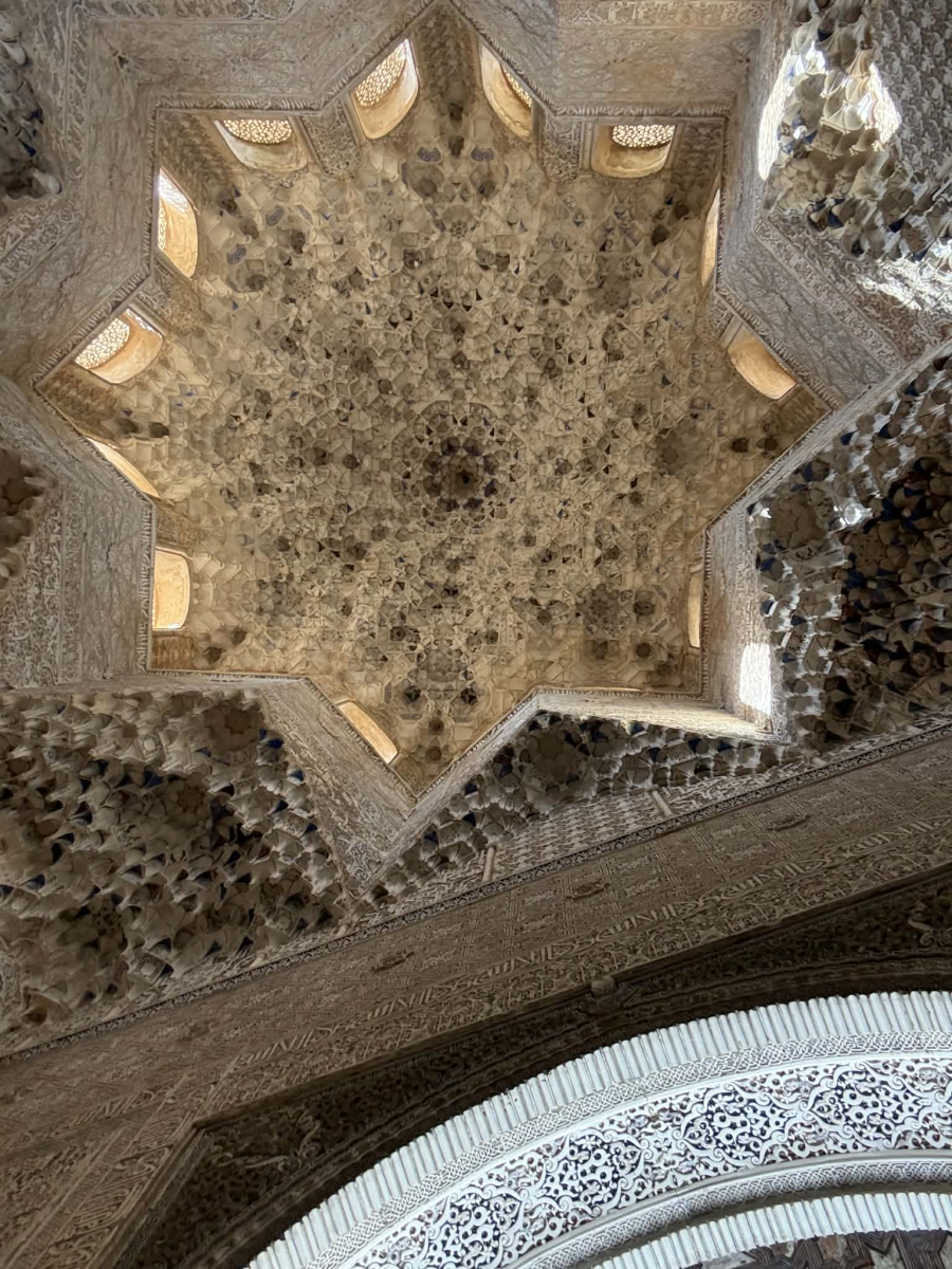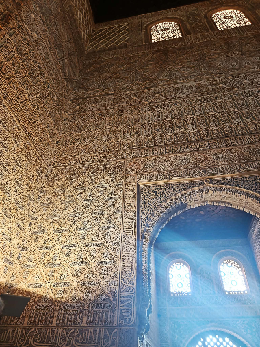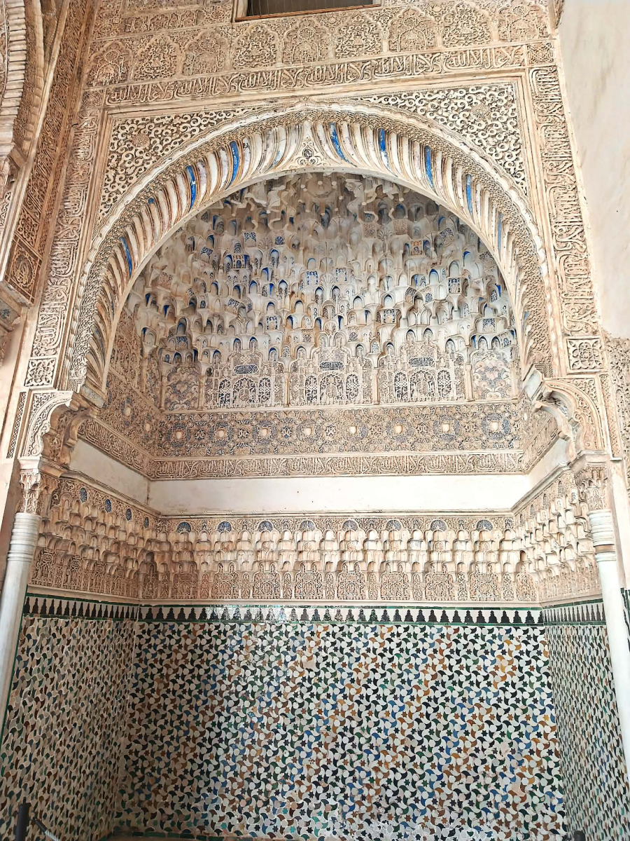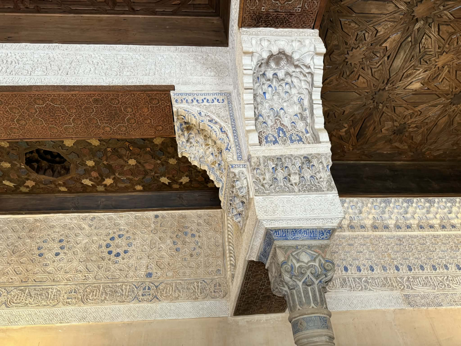 Pałace Nasrydów - czyli oficjalne rezydencje muzułmańskich władców, gdzie toczyło się życie dworskie i istniał harem. Bogactwo dekoracji, niektórzy mówią wafle, ktoś znajduje motyw Maincrafta, ktoś mówi o zwisających wielokształtach, przewodniczka mówi o koronkowych stiukach i rzeźbionych w drewnie cedrowym stropach i kopułach - a wszystko to delikatna praca artystów głównie w gipsie. Piękne łuki, zdobione kolumny, liczne arkady to wprost sceneria wymarzona do niepowtarzalnych zdjęć.