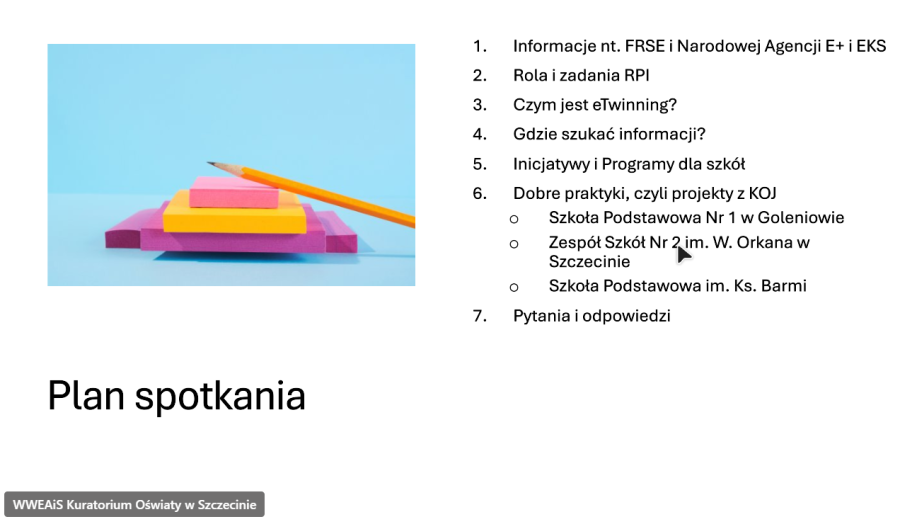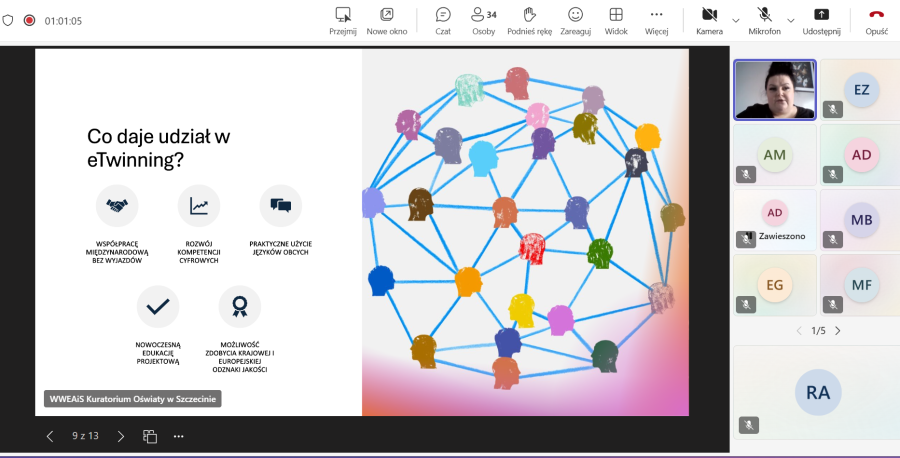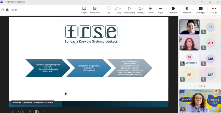 W czwartek odbyło się ponad dwugodzinne spotkanie online, które zorganizował Regionalny Punkt Informacyjny przy Kuratorium Oświaty w Szczecinie. Zaproszenie do podzielenia się dobrymi praktykami, których doświadczyliśmy realizując projekty międzynarodowe otrzymała Pani dr inż. Agnieszka Raducka. Dzieląc się plusami i minusami prowadzenia projektów edukacyjnych z zagranicą nasza nauczycielka podzieliła się doświadczeniami z dwóch punktów widzenia: jako szkolnego koordynatora programów Erasmus+ w sektorze Kształcenie i szkolenia zawodowe oraz jako nauczyciela prowadzącego grupy projektowe w projektach eTwinning: Green energy saves the world, The mathematician from my country, Eco-friendly innovatives clasess oraz Superstutions and legends never die. Poleciła jakie szkolenia warto zrealizować, aby być przygotowanym do obslugi platformy ESEP. Na co zwracać uwagę w pracy z zagranicznymi nauczycielami, jak budować grupę projektową, jakie narzędzia cyfrowe stosować i podała przykłady wspólnych produktów współpracy.