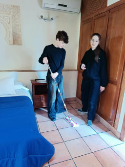 Ola o swoich praktykach: W dzisiejszym dniu moich praktyk wykonywałam różne zadania związane z utrzymaniem porządku oraz przygotowywaniem pokoi dla gości. Do moich obowiązków należało między innymi dokładne ścieranie kurzu z mebli i elementów wyposażenia, takich jak stoły, szafki, komody czy półki. W pokojach, które były jeszcze zajmowane przez gości, poprawiałam łóżka i układałam pościel w taki sposób, aby całość wyglądała schludnie i estetycznie. Zwracałam uwagę na szczegóły, takie jak równe ułożenie poduszek czy kołdry. Dodatkowo kontrolowałam, czy w pokojach nie pozostały rzeczy po poprzednich gościach, takie jak jedzenie, opakowania czy różnego rodzaju śmieci. Dzień zakończyłam sprzątaniem apartamentów.