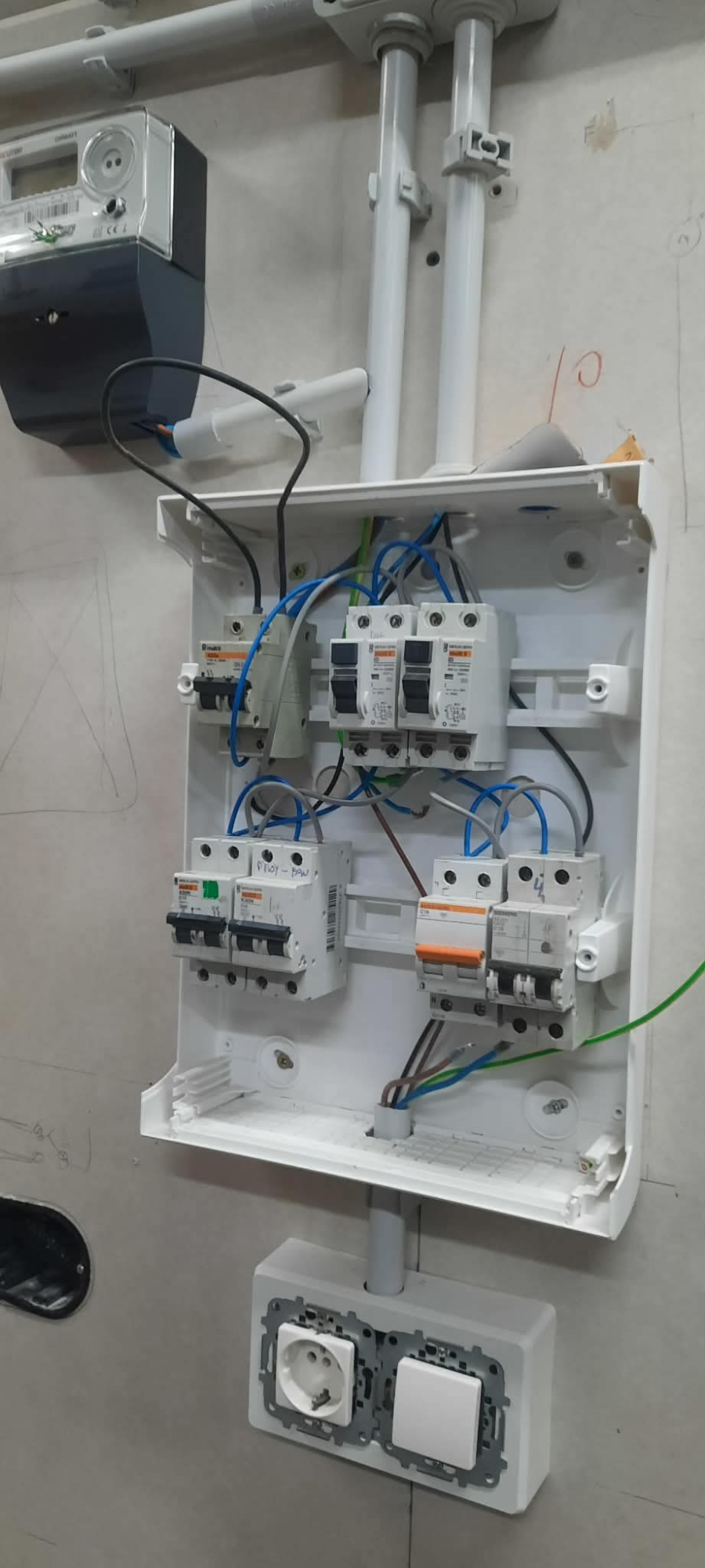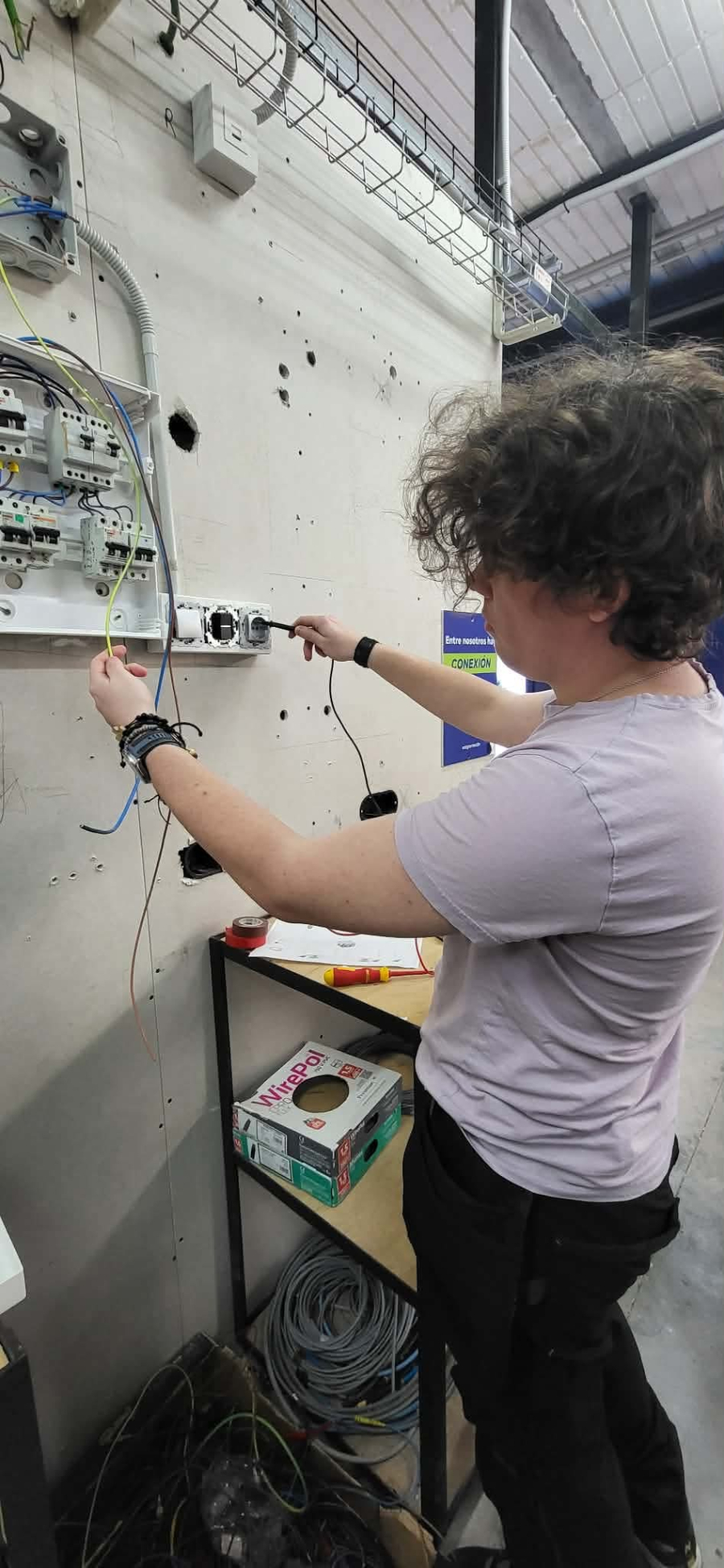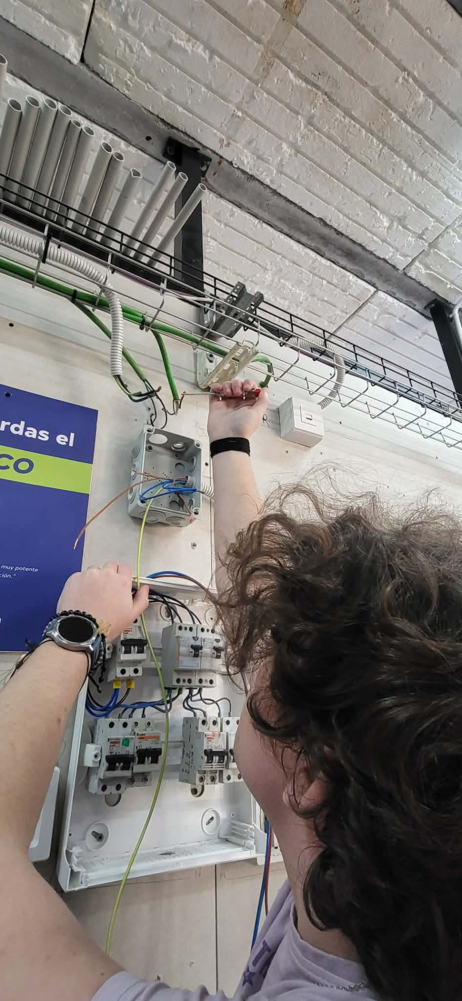 Ada, Fabian i Mateusz: Dzisiaj kontynuowaliśmy prace przy podłączaniu bezpieczników w skrzynkach elektrycznych. Chociaż większość czynności została wykonana, ukańczając jedno zadanie dostajemy szybko następne, więc przed nami jeszcze dużo praktyki i powtórzeń, aby udoskonalić swoje umiejętności. Doszły też prace z multimetrem, który pomaga nam poprzez pomiar parametrów elektrycznych w znalezieniu odpowiedniego przewodu, ponieważ w skrzynce jest dużo różnych funkcyjnie przewodów (fazowe, ochronne, neutralne).