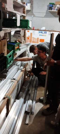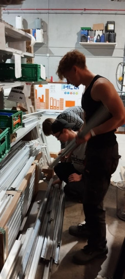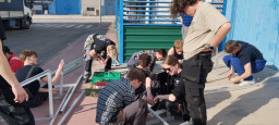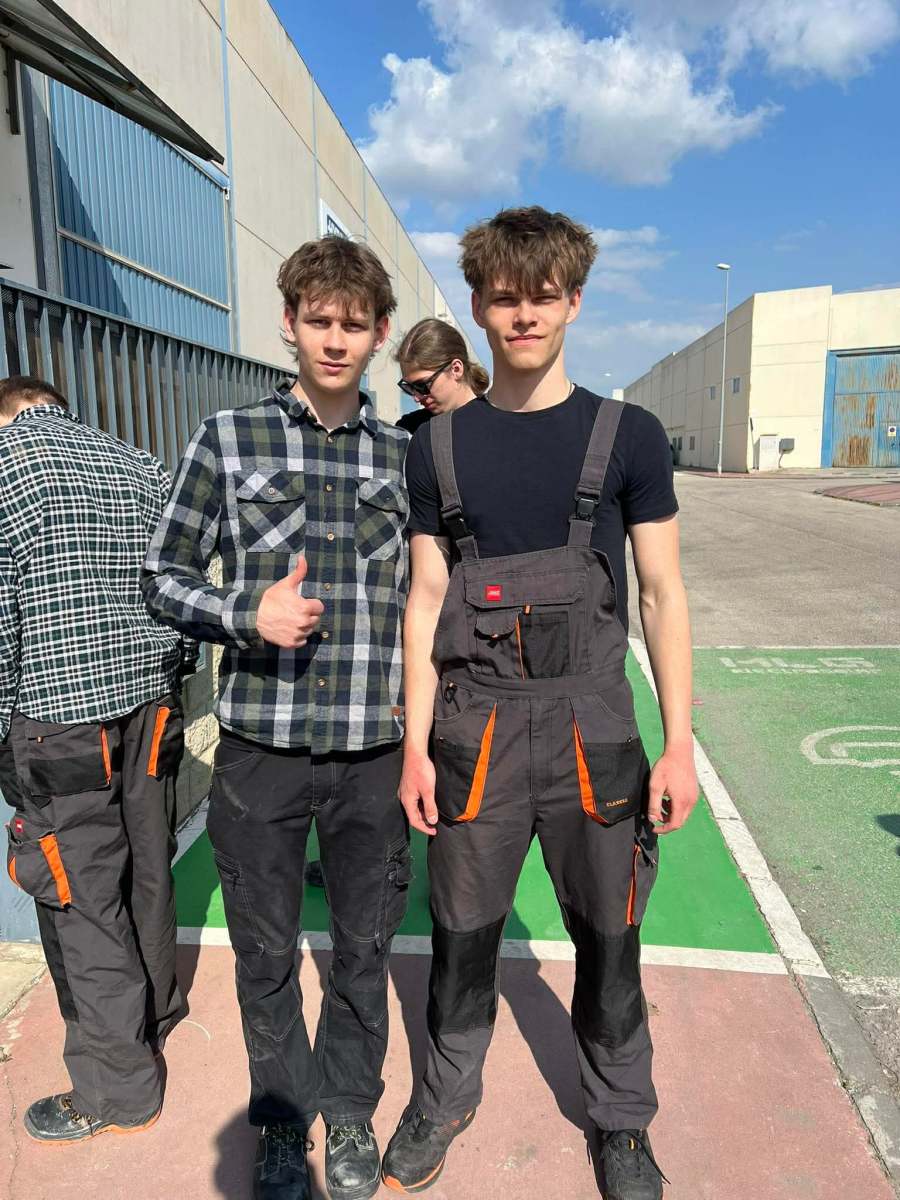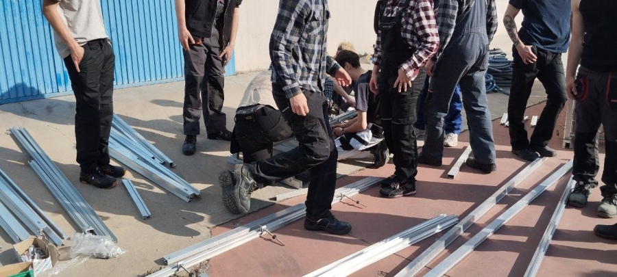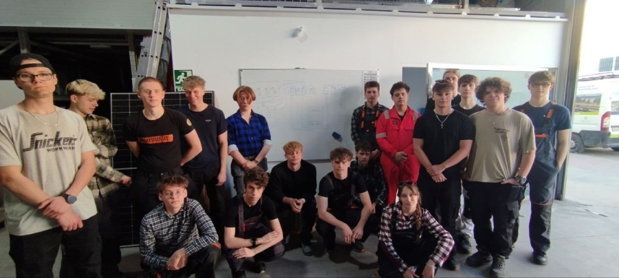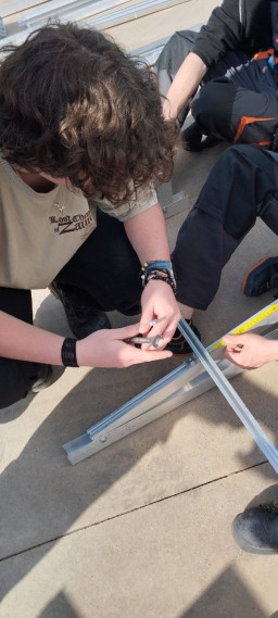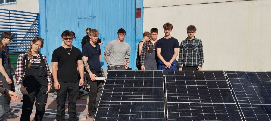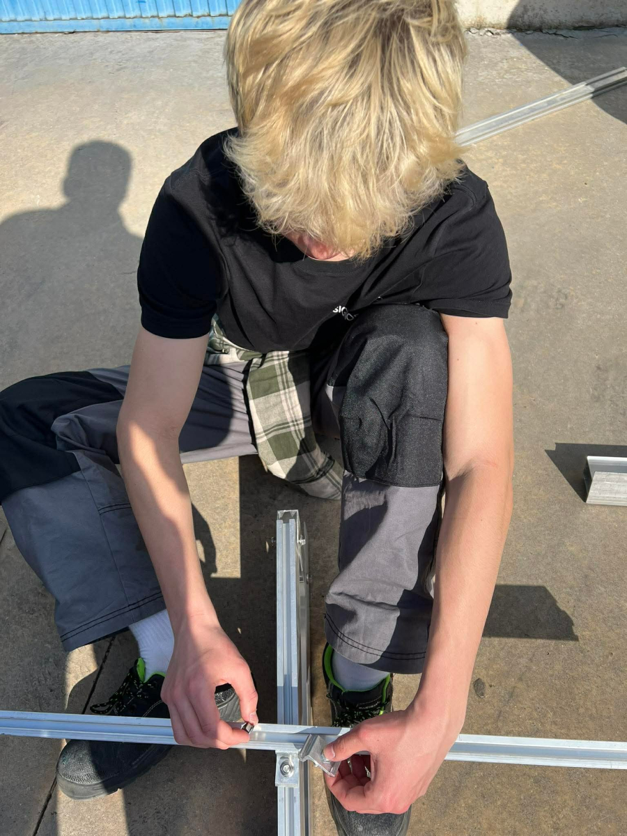 Bartek opisuje przebieg wtorkowego dnia praktyk: Pracowałem przy modułach fotowoltaicznych, gdzie montowałem je na konstrukcji naziemnej oraz pomagałem przy podłączaniu przewodów elektrycznych urządzeń i osprzętu instalacyjnego. Najpierw składałem stelaż, czyli konstrukcję, na której były zamocowane moduły. Skręcałem go, łącząc metalowe elementy śrubami i używając narzędzi, żeby całe mocowanie było stabilne i bezpieczne. Ta praca wymagała dokładności, ostrożności oraz wiedzy technicznej. Nasz opiekun tłumaczył nam jak działa podłączenie falownika i jakie ma zadanie przy połączeniu równoległym oraz szeregowym.