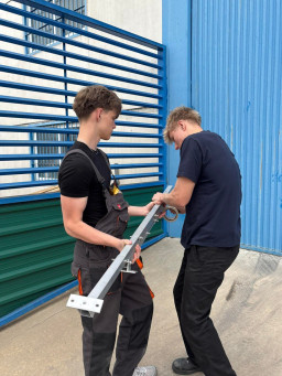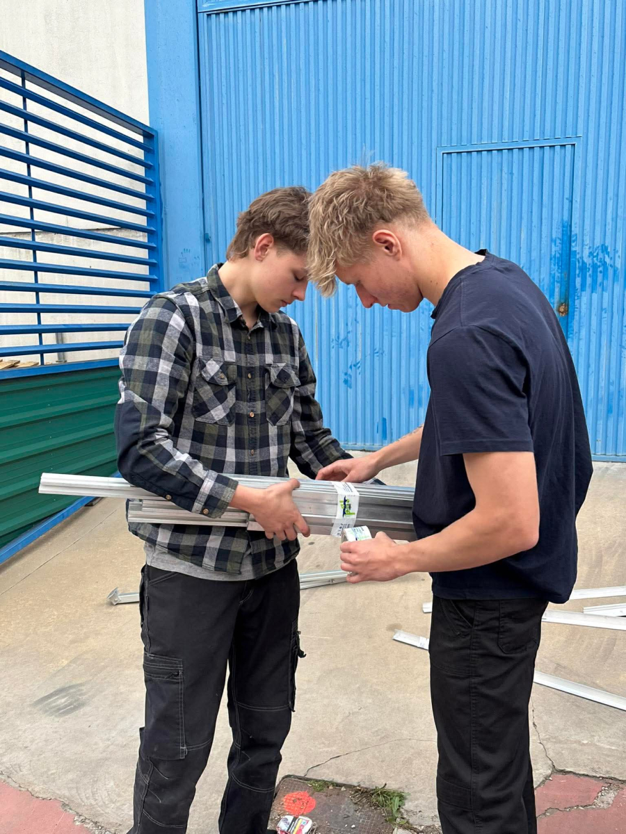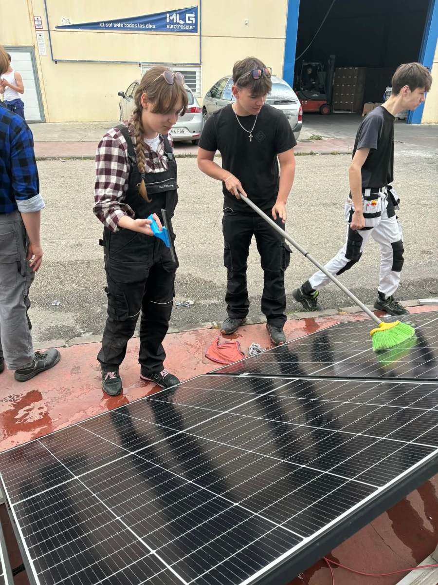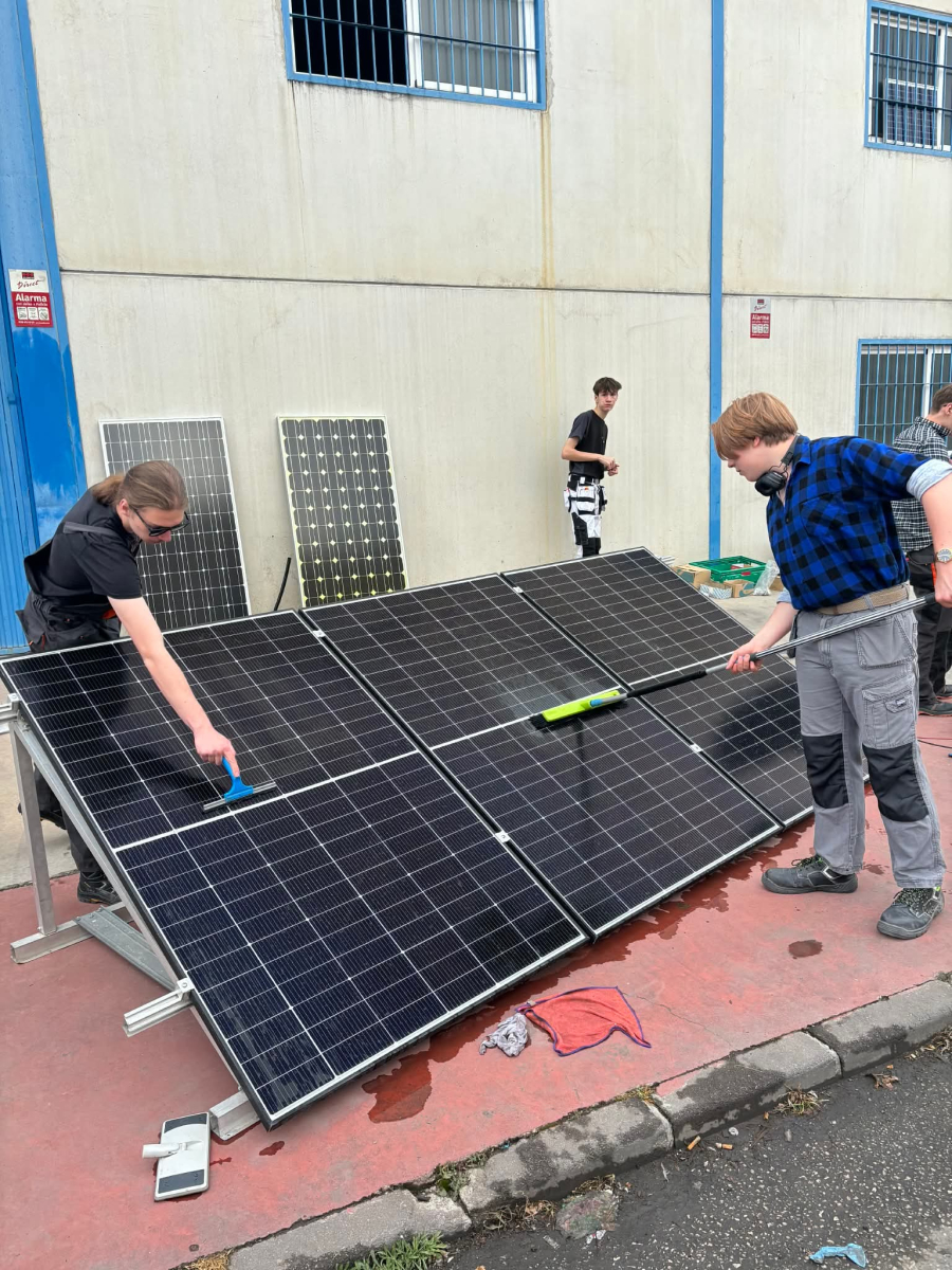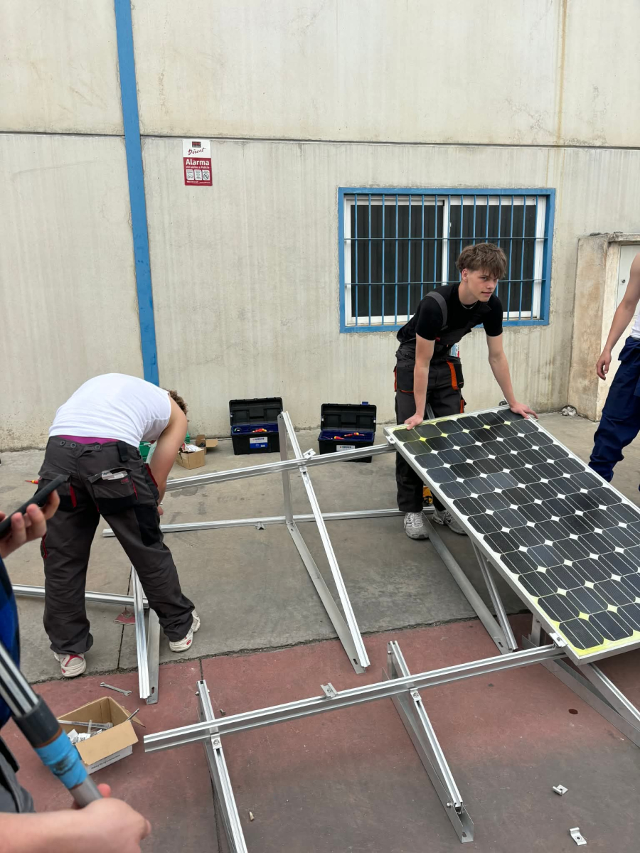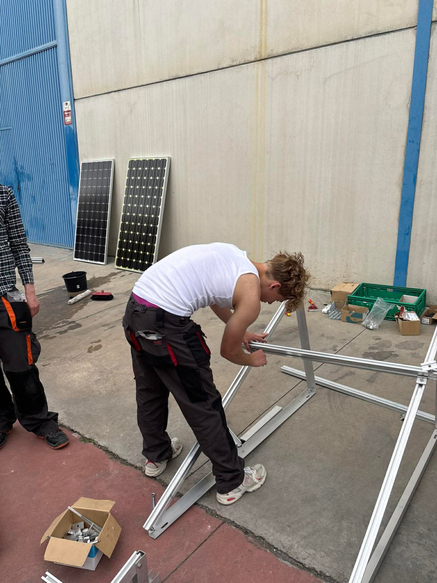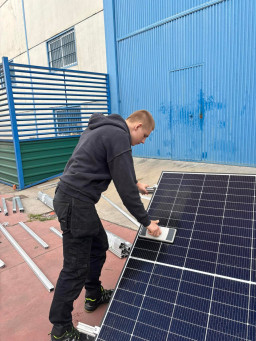 Podczas praktyk zajmowaliśmy się przygotowaniem i montażem elementów instalacji fotowoltaicznej. Najpierw składaliśmy metalowy stelaż, który służy do zamocowania modułów fotowoltaicznych. Dopasowywaliśmy aluminiowe profile i skręcaliśmy je ze sobą, aby konstrukcja była stabilna. Następnie montowaliśmy moduły fotowoltaiczne na przygotowanym stelażu. Przed uruchomieniem instalacji czyściliśmy powierzchnię paneli, aby usunąć kurz i zabrudzenia, przy okazji przećwiczyliśmy metodu czyszczenia i konserwacji. Kolejnym etapem było podłączenie przewodów elektrycznych oraz sprawdzenie poprawności połączeń w skrzynce elektrycznej. Korzystaliśmy przy tym z narzędzi pomiarowych, aby upewnić się, że instalacja działa prawidłowo. Dzięki temu mogliśmy zobaczyć, jak wygląda montaż oraz przygotowanie instalacji fotowoltaicznej w praktyce.