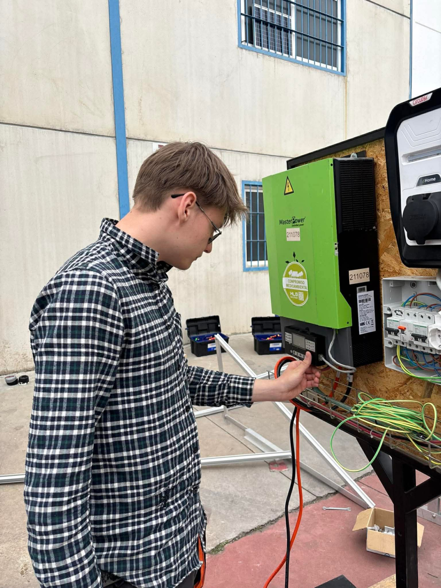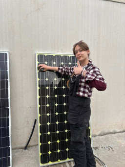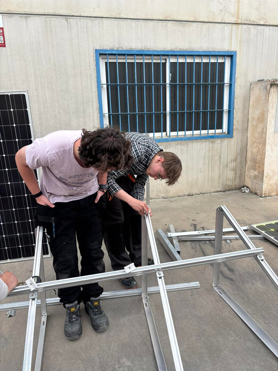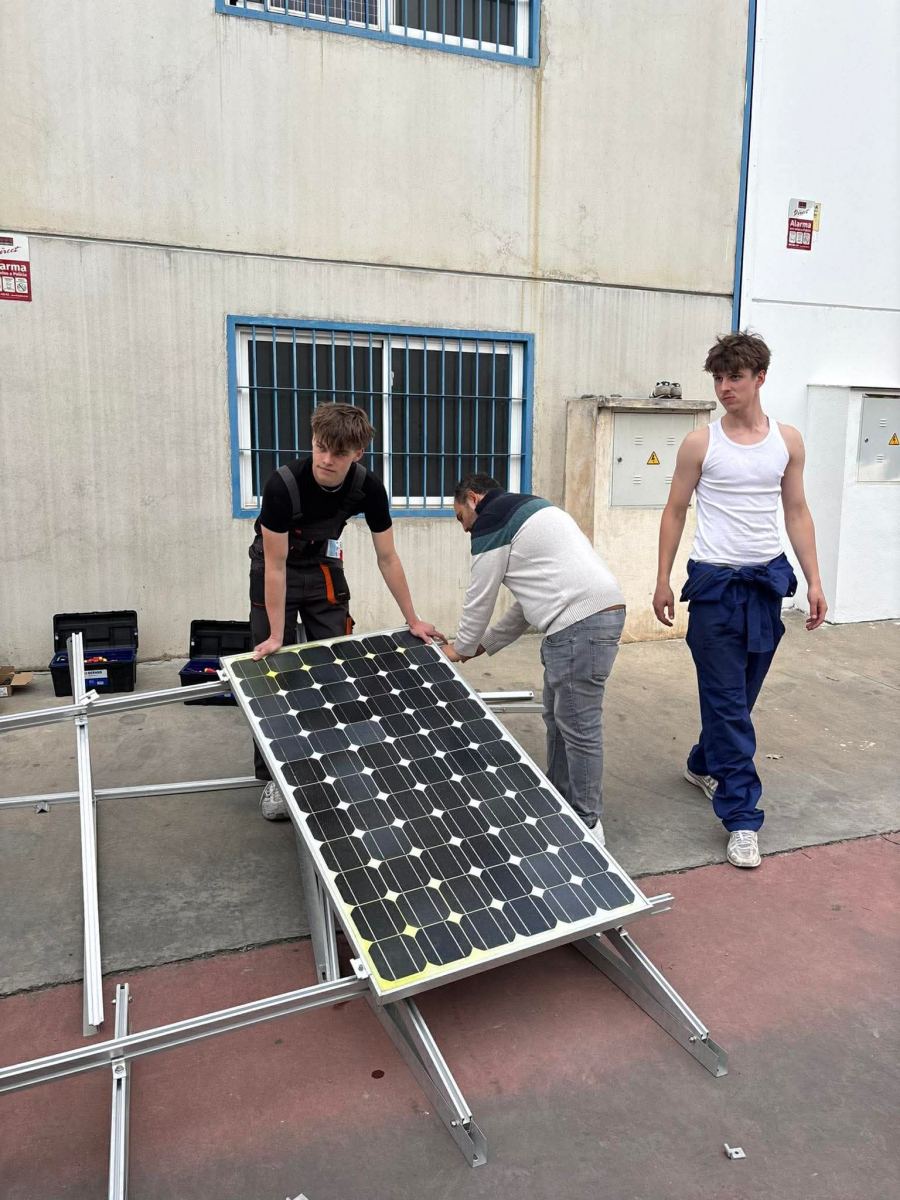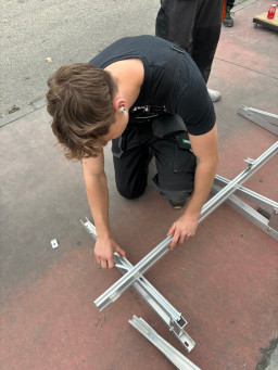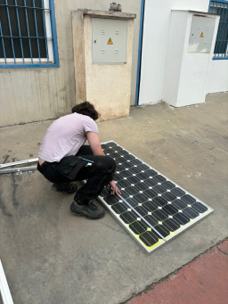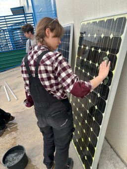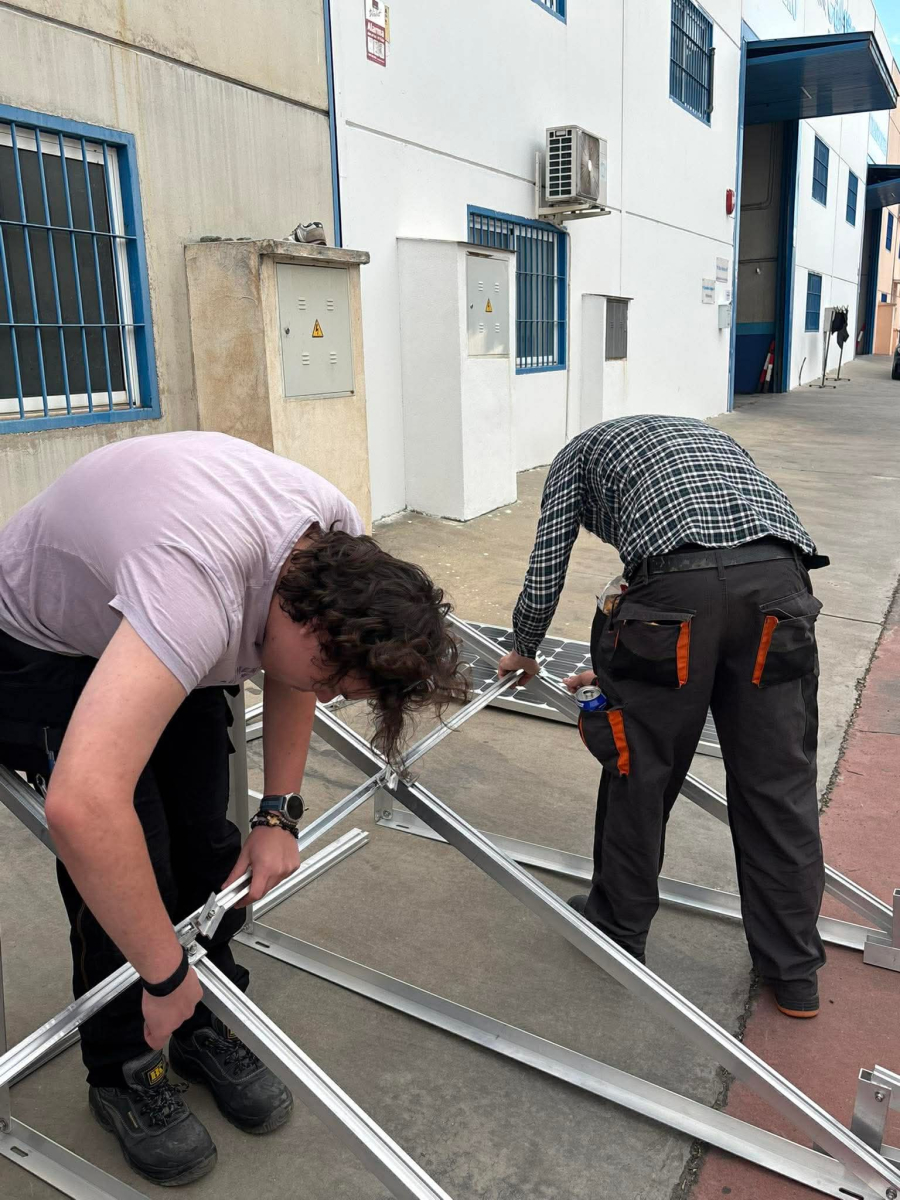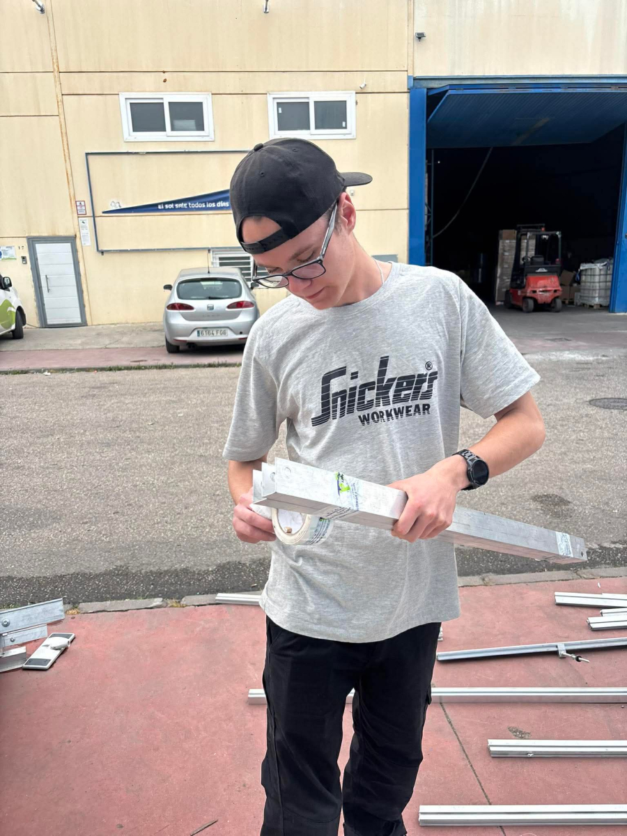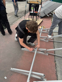 Podczas praktyk zajmowaliśmy się przygotowaniem i montażem elementów instalacji fotowoltaicznej. Najpierw składaliśmy metalowy stelaż, który służy do zamocowania modułów fotowoltaicznych. Dopasowywaliśmy aluminiowe profile i skręcaliśmy je ze sobą, aby konstrukcja była stabilna. Następnie montowaliśmy moduły fotowoltaiczne na przygotowanym stelażu. Przed uruchomieniem instalacji czyściliśmy powierzchnię paneli, aby usunąć kurz i zabrudzenia, przy okazji przećwiczyliśmy metodu czyszczenia i konserwacji. Kolejnym etapem było podłączenie przewodów elektrycznych oraz sprawdzenie poprawności połączeń w skrzynce elektrycznej. Korzystaliśmy przy tym z narzędzi pomiarowych, aby upewnić się, że instalacja działa prawidłowo. Dzięki temu mogliśmy zobaczyć, jak wygląda montaż oraz przygotowanie instalacji fotowoltaicznej w praktyce.