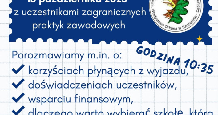 Czeka Was podróż po Europie bez wychodzenia z domu. Nasi uczniowie przedstawią inspirujące historie z własnych praktyk zawodowych, realizowanych za granicą. Poznacie możliwości, jakie daje program Erasmus+ VET oraz dowiecie się dlaczego warto w nim uczestniczyć.