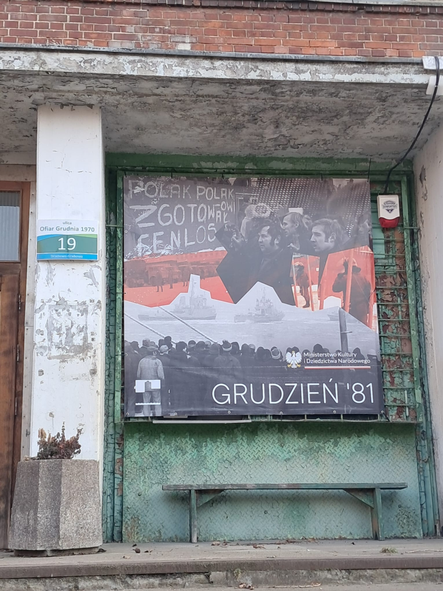 Nasze spotkanie rozpoczęliśmy pod świetlicą na terenie stoczni – miejscem o szczególnym znaczeniu historycznym. To właśnie tutaj toczyły się najważniejsze rozmowy w czasie strajku okupacyjnego w grudniu 1981 roku, już po wprowadzeniu stanu wojennego. Uczniowie mogli poznać kontekst wydarzeń, które na trwałe zapisały się w historii miasta.